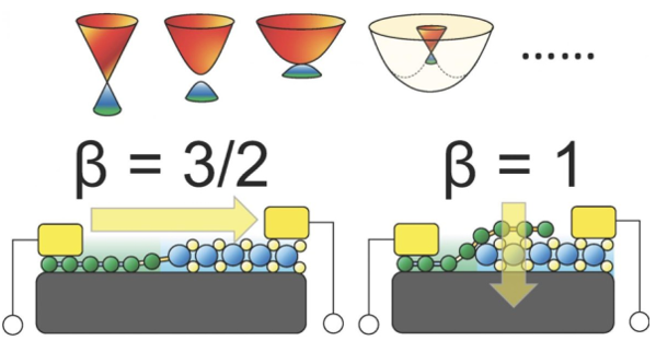 上图是基于2D材料的横向(左)和垂直(右)肖特基二极管的示意图。对于广泛类别的2D材料,对于横向和垂直肖特基二极管,电流-温度关系普遍可以分别通过3/2和1的标度指数来描述