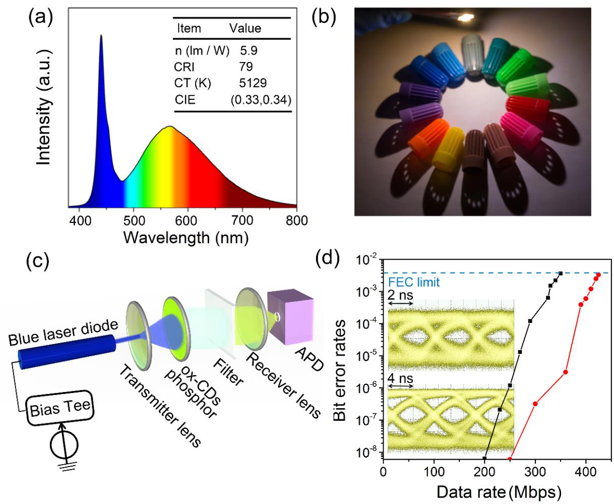 (a , b) 基于 ox-CDs 荧光粉 制备的白光器件, (c) 光通讯系统的光路示意图, (d) 信号传输速率测试。