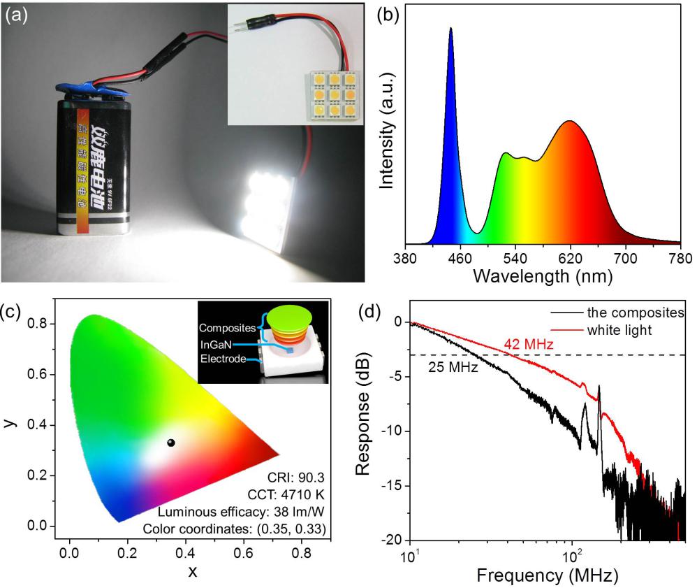 (a) 白光光源的照片、 (b) 发光光谱以及 (c) 色坐标。 (d) 基于半导体量子点光通讯器件带宽测试曲线。