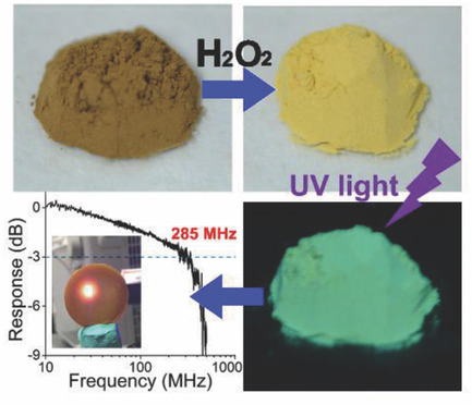 曲松楠课题组利用过氧化氢溶液对以柠檬酸与尿素为原材料,微波法合成的原本 固态荧光猝灭的碳纳米点进行氧化处理,该方法不同于被较多报道的将碳纳米点掺杂进入例如 PVA 或无机盐等基质的方法,处理后的碳点获得宽带隙的表面能级结构,抑制了碳纳米点聚集态下表面态的无辐射跃迁过程,获得固态下荧光量子效率 25% 的黄绿光碳纳米点。以所研制的碳纳米点荧光粉作为颜色转换层,通过调节碳点荧光粉的比例,制备出不同色温的白光 LEDs 。所研制的碳点荧光寿命只有几个纳秒 (~ 6ns) ,将其作为光转换层,制备可见光通信领域器件,国际上首次实现了带宽为 285MHz 、信号传输速率为 435 Mbps 的基于碳纳米点的可见光通信。
