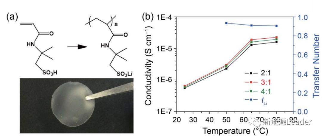 实验中采用的聚合物电解质结构如下图所示(聚(丙烯酰胺-2-甲基-1-丙烷磺酸钠)锂PAS),在该分子结构中只有Li是能够移动,因此Li 的迁移数也很高,达到0.9左右。为了进一步改善PAS的机械性能和Li 电导率,作者将PAS与PEO(聚氧化乙烯)混合在一起,PEO与PAS的相互作用也促进了Li 沿着PEO的长链进行移动,从下图能够看到PEO:PAS=3:1时电解质的电导率最高,在65℃下可达1.8x10-5S/cm,由于是单离子导电因此Li 的迁移数高达0.87-0.95,表明绝大多数的电导率都是由Li 贡献的,这对于减少极化,提升倍率和循环性能有正面的帮助。