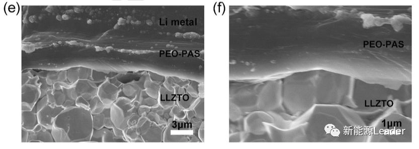 石榴石固态电解质在室温下电导率可达4x10-4S/cm,在65℃下可达1x10-3S/cm,但是其与金属Li负极之间接触比较差,导致阻抗增加,因此Weidong Zhou将石榴石电解质(450um厚)与一层PEO-PAS聚合物电解质(约5um厚)复合在一起,由于PEO-PAS厚度较薄,因此尽管其电导率较低,但是引起的阻抗相对较小,复合电解质整体的Li 电导率可达1.5x10-4S/cm。同时由于PEO-PAS良好的机械特性,大幅降低了金属Li负极与固态电解质之间的接触阻抗,在没有聚合电解质涂层时,Li/LLZTO/Li的界面阻抗达到了5000欧姆,而在石榴石电解质表面增加了聚合物涂层后,界面阻抗下降到了400欧姆。
