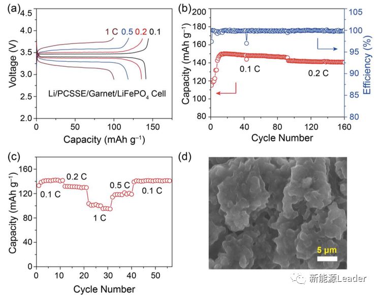 下图为采用Li/石榴石电解质/LFP制作的全电池的电化学测试结果,从下图a能够看到,该全电池表现出了良好的倍率性能,在0.1C倍率正极容量可达145mAh/g,在0.2C倍率下正极可逆容量达到140mAh/g,当然由于全固态电池阻抗较大,相比于液态电解液电池还是具有一定的差距。从图b可以看到该电池的首次库伦效率可达97%,并且在0.2C倍率下循环160次后,可逆容量仍然高达137mAh/g,循环中电池的库伦效率达到99.9%,表明该电池具有良好的电化学稳定性。电池循环后,作者将其拆解,金属Li负极表面沉积比较均匀,并没有明显的Li枝晶生长的痕迹(如下图d所示)。