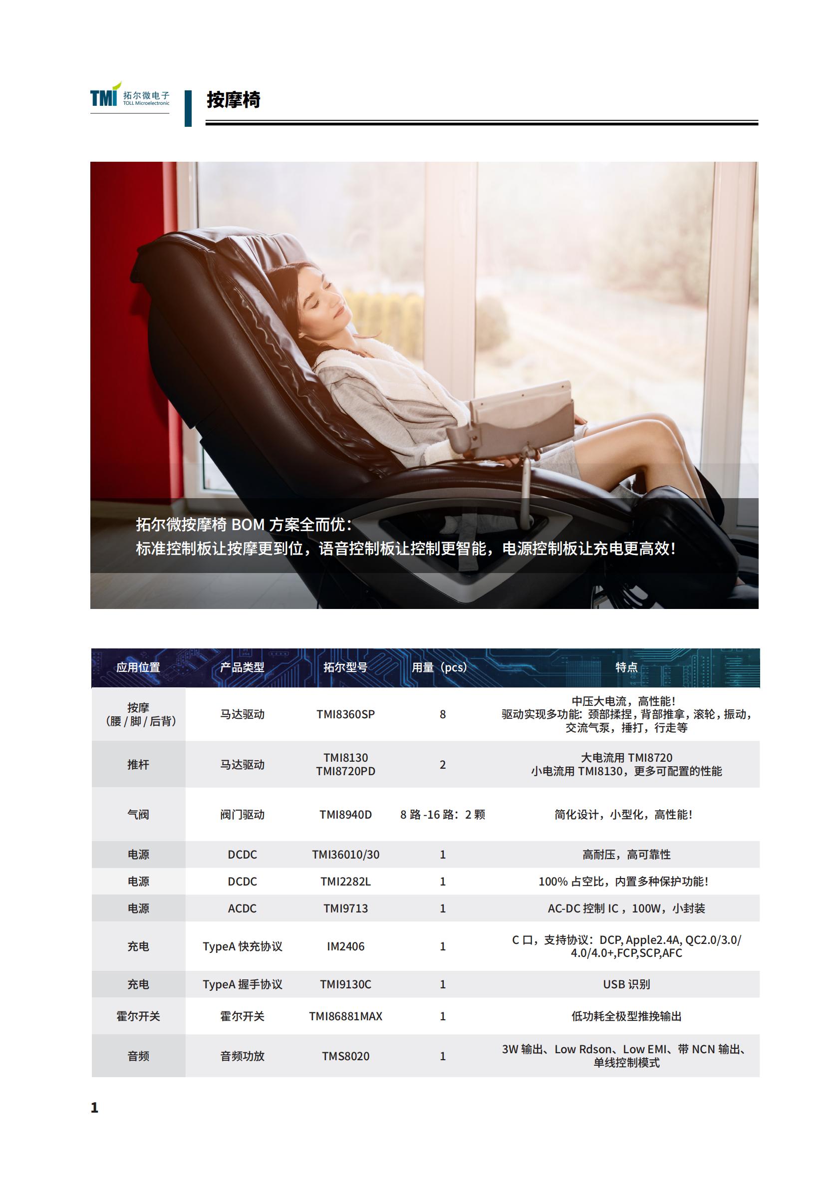 想要产品实力好,芯片解决方案至关重要!拓尔微在芯片领域有多年积累与沉淀,已有多款电源管理芯片、马达驱动芯片,充电&霍尔开关等形成全套按摩椅解决方案。为满足市场上各类按摩椅产品设计的选型需求,为客户提供一站式优质服务,我们推出了按摩椅专题期刊——