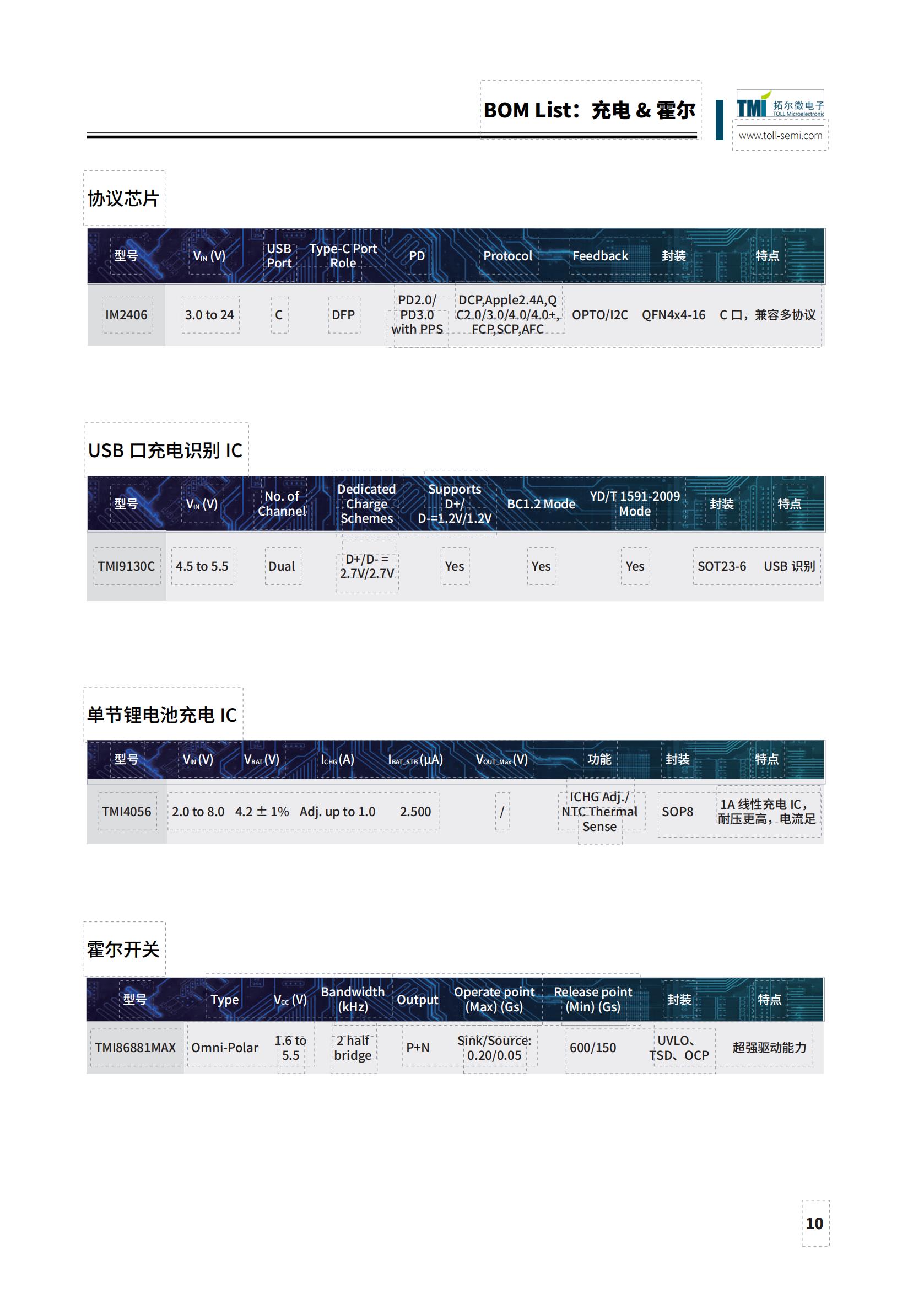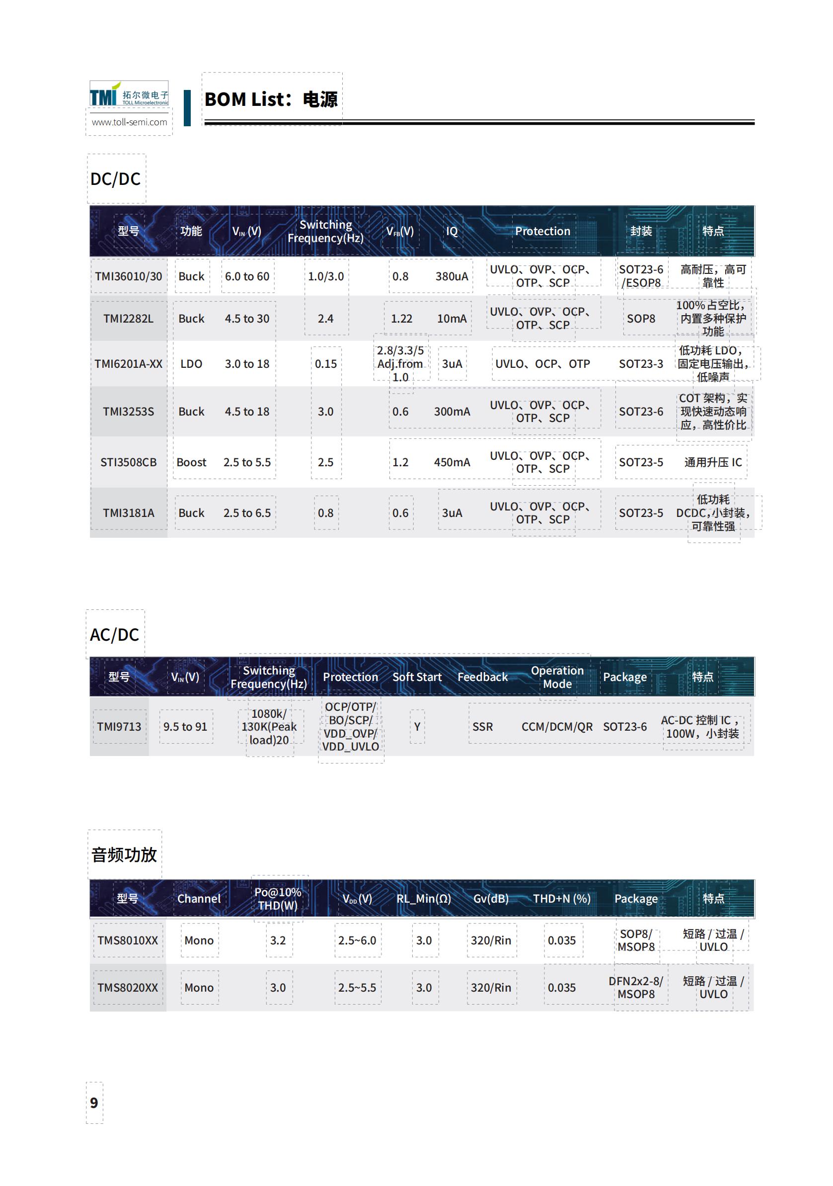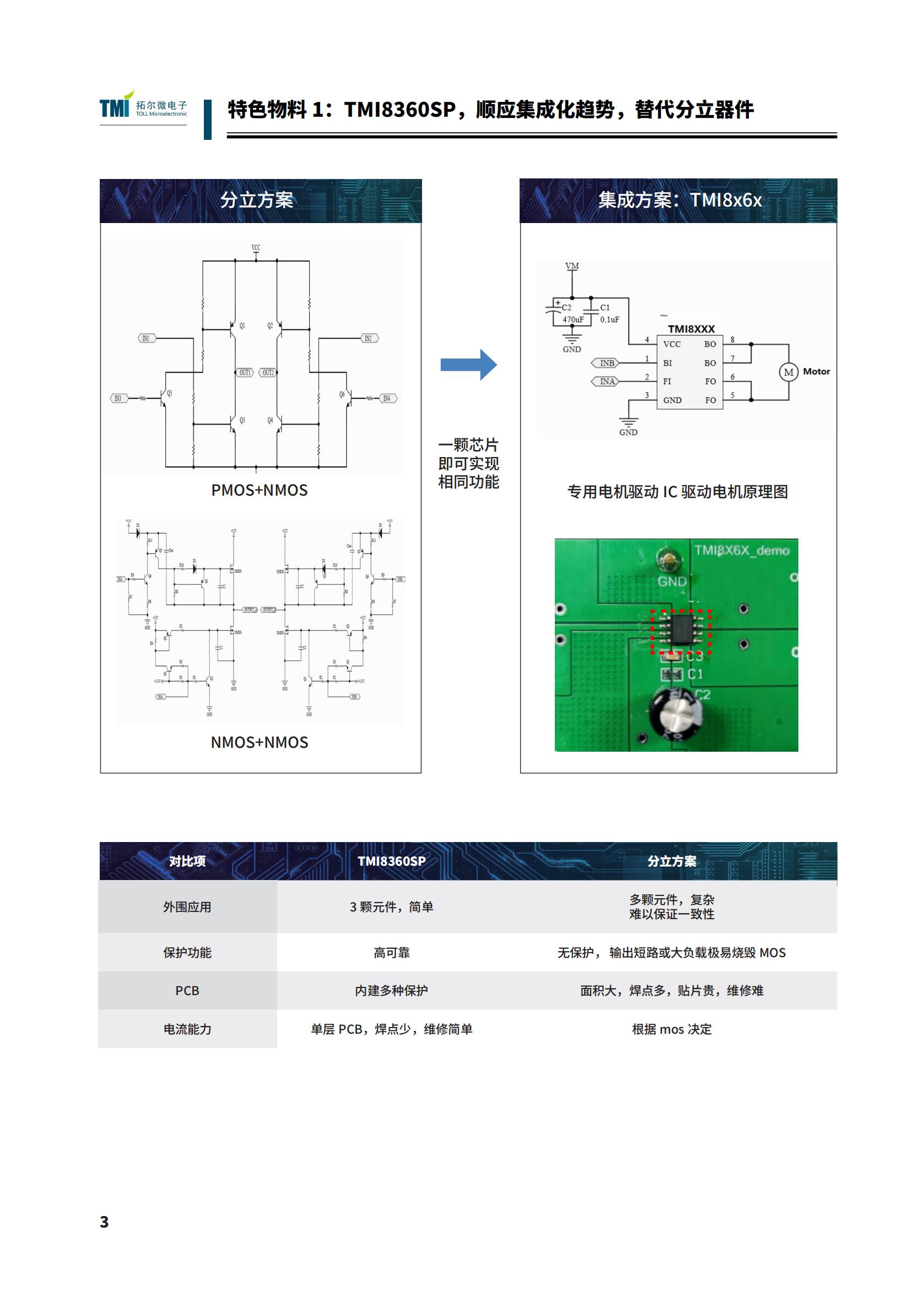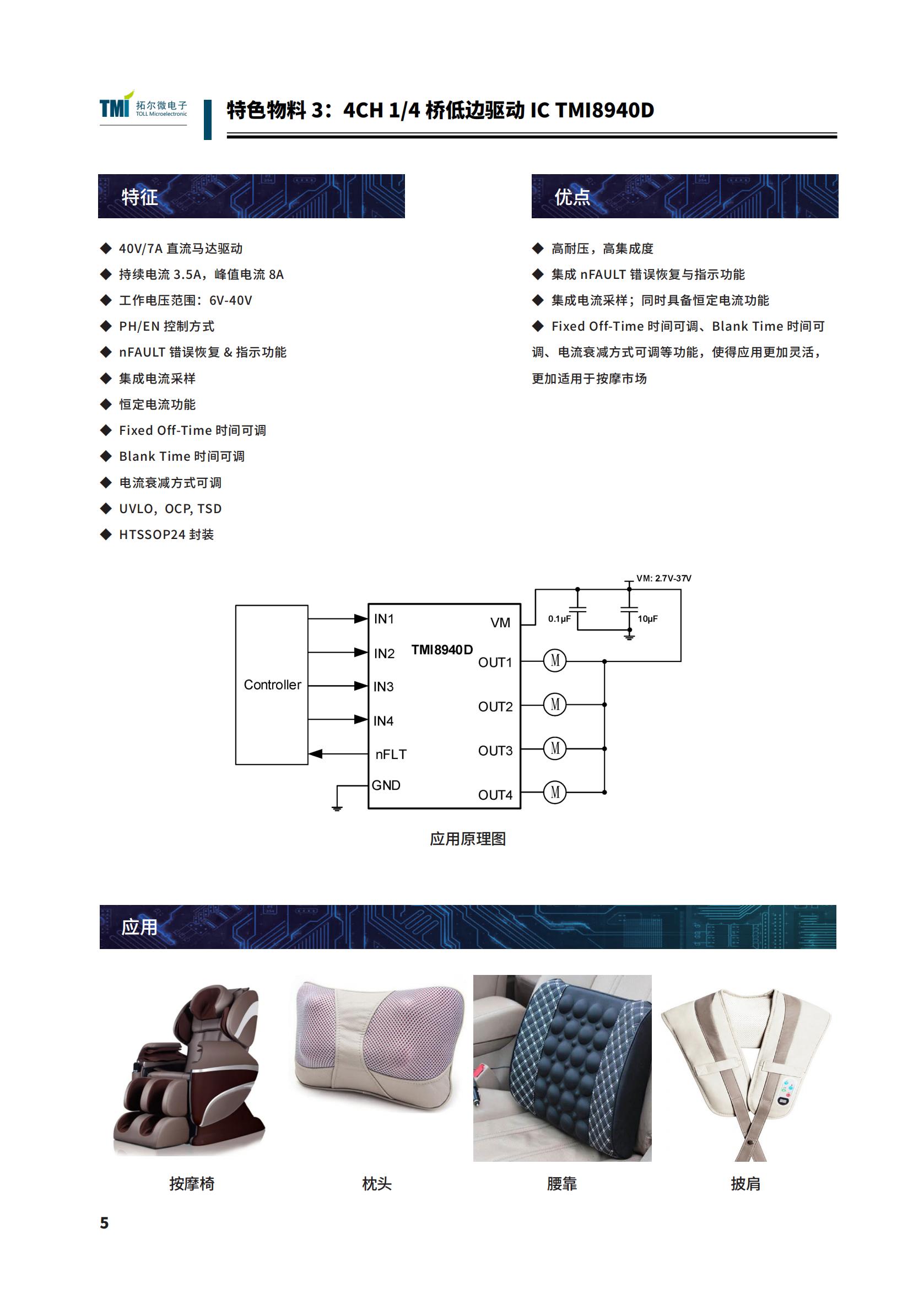 本期刊重点介绍了按摩椅系列拓尔BOM方案,物料清单及5款特色物料,包括产品的特点、应用注意事项、适用场景等——TMI8360SP替代继电器方案和分立器件方案、40V3.5A直流马达驱动IC-TMI8130、4CH 1/4桥低边驱动IC TMI8940D、TMI36010高压60V1A异步降压转换器、3W单通道D类音频功放TMS8010/TMS8020。