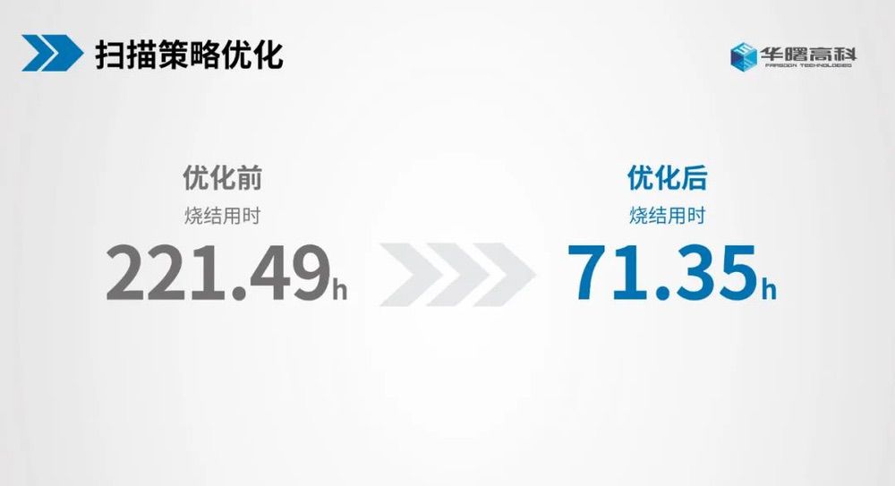 为确保大尺寸工件质量与效益兼具,华曙高科采用多激光搭接技术,自主研发快速搭接算法,有效解决了多个激光之间的激光一致性、扫描振镜搭接校准、搭接稳定性、多激光扫描任务分配等问题;采用先进扫描策略,通过针对性的优化参数,实现激光、振镜的耦合控制,在保障内部冶金质量的同时,较大提升效率,相比优化前,可以节省约39%的延时用时。
