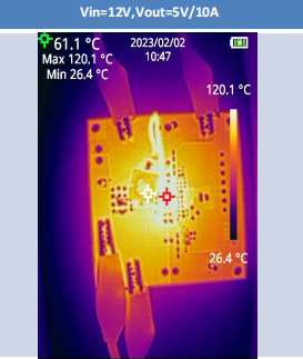 温升测试如下图,TMI32120满载时热测试数据(OTP=160°C),Vin=12V, Vout=5V/10A,输出功率高达50W条件下,在3.5mmx3.5mm小封装条件下的芯片表面温升仅有94℃,发热小,效率高,能有效降低和控制系统整体的温度。