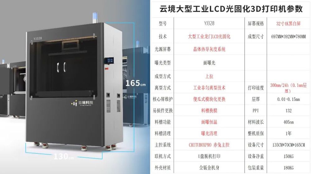 云境科技负责人告诉南极熊,YJ328是他们专为工业应用场景研发的大型LCD光固化3D打印机。这台设备集多项自主创新发明核心技术,在大面积离型式层堆叠方案的加持下,实现高效产出效率。