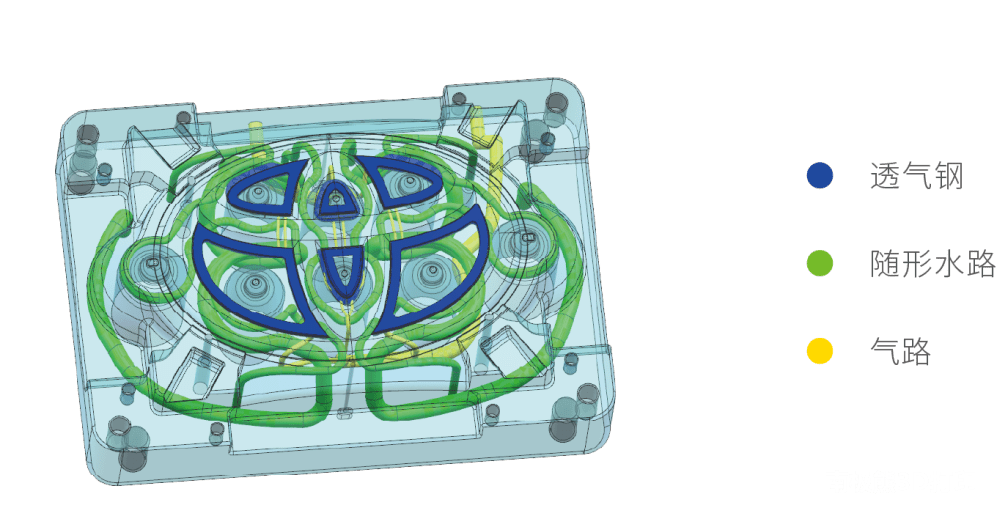 目前,金属3D打印已经在很多领域展现出了强大的应用能力,在注塑模具上,更高效率的3D打印随形水路的应用已经成为常态;在透气钢领域,如毅速公司推出的新一代3D打印随形透气钢技术,相比常规透气钢,强度高、硬度大、不限位置形状、随形透气的特点极大的扩展了透气钢的应用范围和领域。