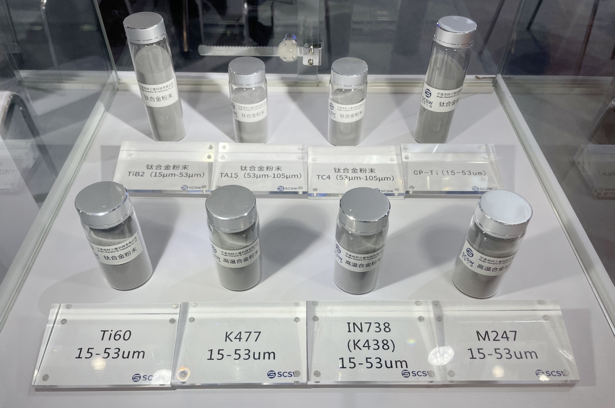 本次展会尚材三维携旗下钛合金粉末等产品亮相,尚材三维钛合金粉末采用电极感应熔炼气雾化(EIGA)制粉,在保护气体条件下将预制好的合金棒材进行区域精炼,通过惰性气体雾化金属液流制备粉末。展出的产品有TC4、TA15、TA1等常用材料,另外还有高温钛合金材料,包括Ti2AlNb、Ti60等,面向3C行业也有展示0-20um粒度的产品。