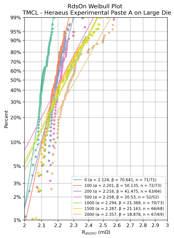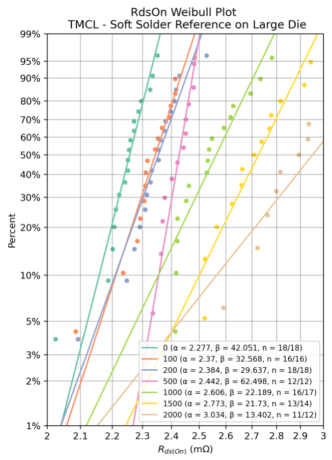 结论:如图7所示,高铅焊料在500至1000次循环之间平均导通电阻出现显著的变化;在1500次循环测量中观察到平均𝑅𝐷𝑆𝑜𝑛相对增加超过20%。可明显观察到器件电气性能的系统性退化。