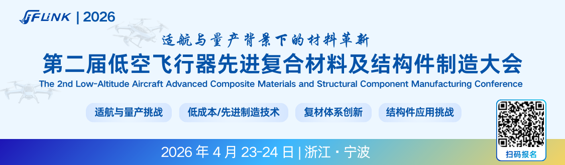 由Flink启明产链主办的“2026(第二届)低空飞行器先进复合材料及结构件制造大会”将于4月23-24日在浙江·宁波召开。本届大会以 “适航与量产背景下的材料革新”为主题,聚焦低成本/先进制造技术、复材体系创新、结构件应用验证、智能检测与仿真认证等关键议题,诚邀主机厂、零部件供应商、材料企业、装备制造商、科研院所及第三方检测认证机构共聚一堂,通过前沿趋势分享与技术实践交流,为我国低空飞行器产业的高质量发展与商业化成功注入强劲的“材料动力”。