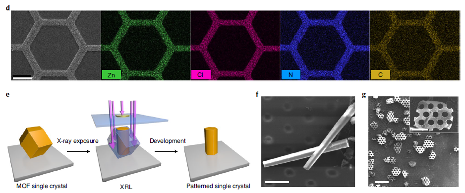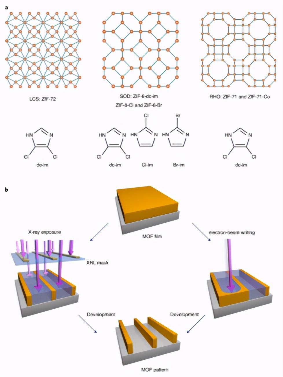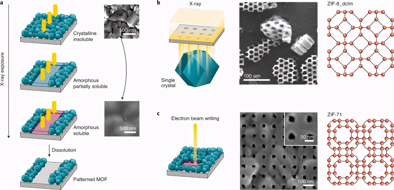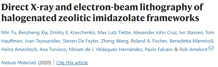 Rob Ameloot等人别出心裁,利用了卤化的沸石咪唑酸酯骨架(ZIF)这一种MOF材料在辐射下可溶解的特点,实现了在X射线或电子束光刻过程中对暴露区域的选择性溶解。