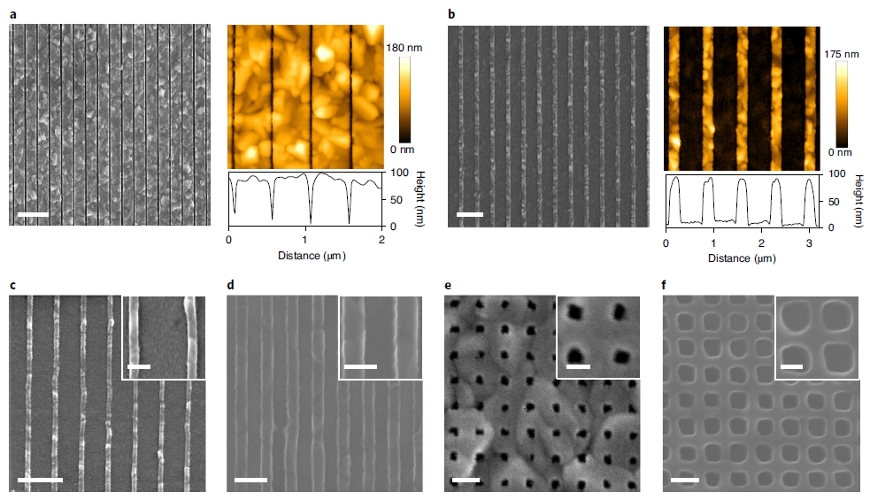 为了进一步提高分辨率,Rob Ameloot等人使用了电子束替换了X射线,并成功的在ZIF-71薄膜中制造了亚50纳米孔阵列(图1c),这是迄今为止报道的MOF材料中最小的特征尺寸。为了维持MOF材料本身的孔隙率,Rob Ameloot等人使用聚合物对孔进行了填充。