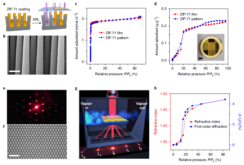 最后,Rob Ameloot等人制备了具有周期性微图案的ZIF-71膜,并将其作为响应衍射光栅,用于蒸汽检测。MOF材料中的孔吸收到蒸气后,会导致折射率增加,从而导致衍射效率发生变化,再通过相机实现对蒸气的检测。