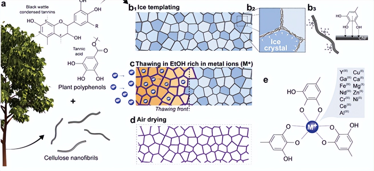 为了应对这些挑战,阿尔托大学Orlando J. Rojas教授和Bruno D. Mattos提出利用含单宁的CNF溶液通过冻融干燥 (FTD)的方法合成坚固的MPN泡沫,从而产生真正均匀的轻质MPN-CNF泡沫(图1)。作者在乙醇解冻介质中加入了金属硝酸盐,从而能够原位形成MPN。