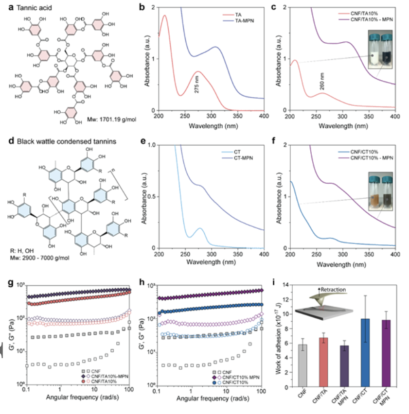 作者首先研究了单宁-纤维素(TA-CNF)的相互作用和MPN在水悬浮液中的组装。与缩合单宁(CT)相比(图2a),单宁酸与纤维素的键合更强(图2d)。紫外光谱显示分配给TA的峰有明显的蓝移(图2b-c)。与纯TA和CT溶液相比,CNF/TA和CNF/CT 悬浮液显示出更高的非特异性吸光度,TA与纤维素表现出更高的结合能力,这主要是氢键和π相互作用。
