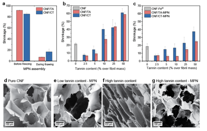 TA-CNF泡沫在解冻-干燥后产生了约20%的收缩,在Fe(III)-乙醇溶液中解冻后,用5-10%的单宁酸获得密度最低、形状最逼真的泡沫,用于MPN组装(图3e)。在纯乙醇中解冻冷冻的单宁-CNF前体,单宁的极限是10%,之后泡沫细胞壁的局部密度急剧增加,克服了在较低质量分数下观察到的单宁的交联(图3a),从而导致40-60%的收缩和泡沫的榻缩(图3f)。通过在富含Fe(III)的乙醇中解冻单宁-纳米纤维悬浮液,MPN就地形成,并导致强大的细胞壁,即使在单宁含量高达50%的CNF/TA和25%的CNF/CT系统中也能维持干燥应力(图3g)。