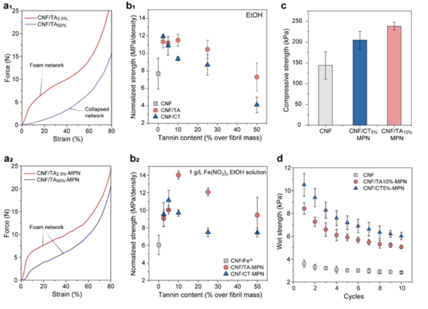 小结:作者开发了一种坚固且通用的方法来制造MPN泡沫,其物理机械性能可通过选择多酚配体的类型和浓度来定制。该方法包括在含单宁的纤维素纳米纤维被冰模板化后促进 MPNs 原位组装。采用这种策略,可以获得压缩强度高达 250 kPa、收缩率低至 ca.5% 的泡沫。