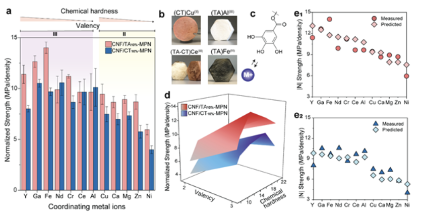 作者接下来探索了含单宁的CNF创建MPN泡沫的通用性。作者使用了钇(Y)、镓(Ga)、钕(Nd)、铬(Cr)、铈(Ce)、铝(Al)、铜(Cu)、钙(Ca)、镁(Mg) 锌 (Zn) 和镍 (Ni)的乙醇可溶性硝酸盐以研究该方法的多功能性并探索金属离子对所得 MPN 泡沫性能的影响。作者将TA和CT含量固定为10%,并观察到金属离子对 MPN 泡沫所得机械强度的明显影响(图5a)。所有 MPN 泡沫都具有较高的机械强度并显示出高形状保真度(图 5b)。唯一不同的因素是离子-配体相互作用发生在MPN 组件(图 5c)。